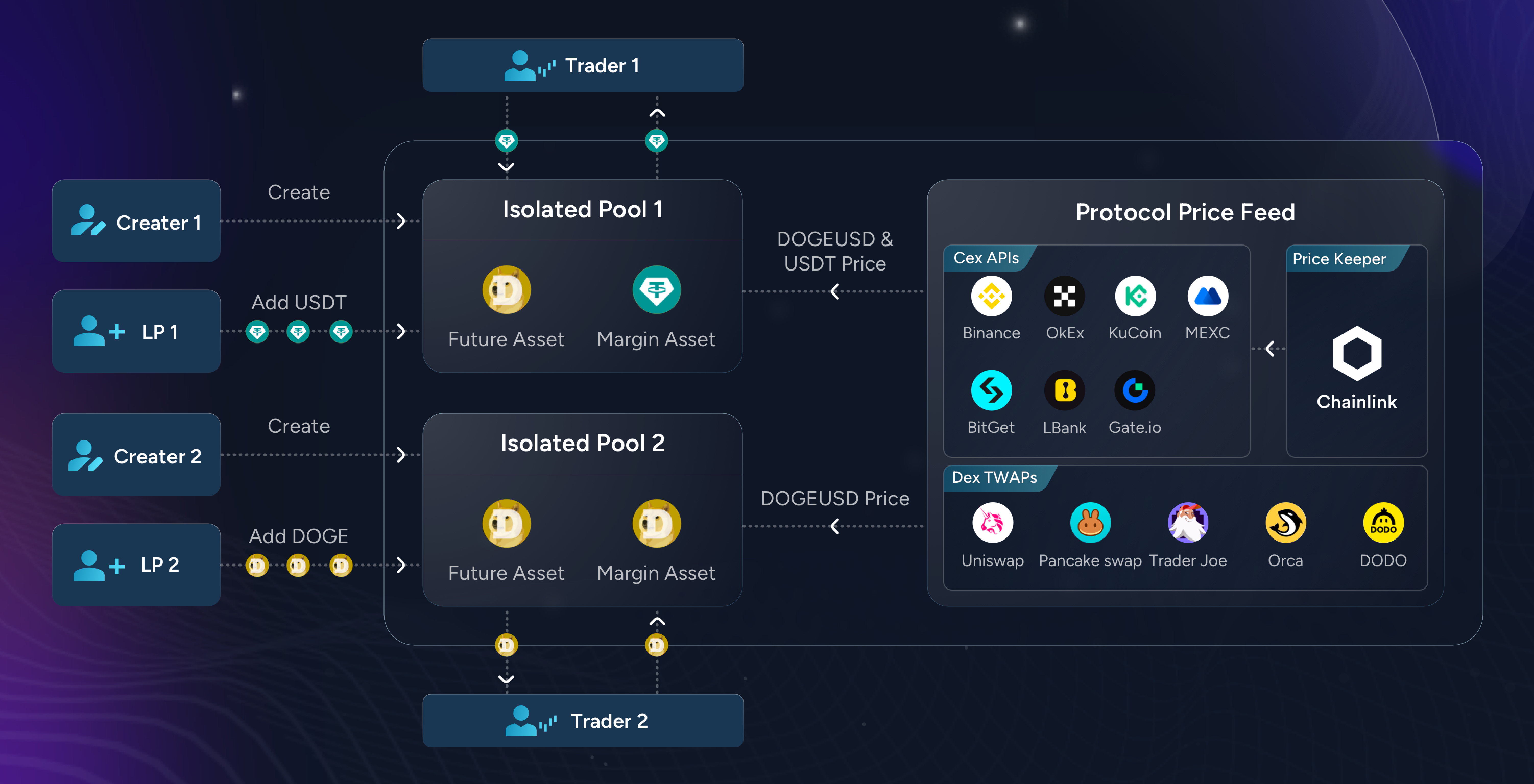 Anyone can add liquidity to the isolated pools to become liquidity providers (LPs) and earn protocol income as well as profits from traders’ liquidation losses. The recognition of an LP is evidenced by the holding of LP tokens.